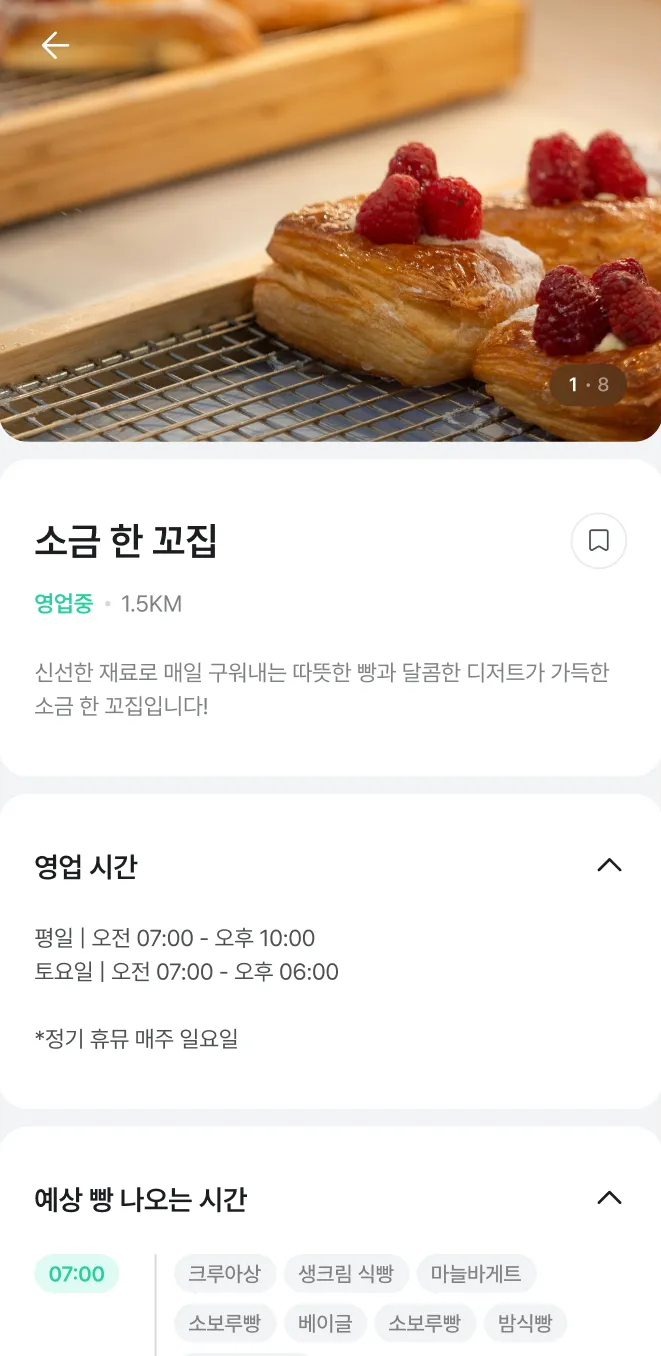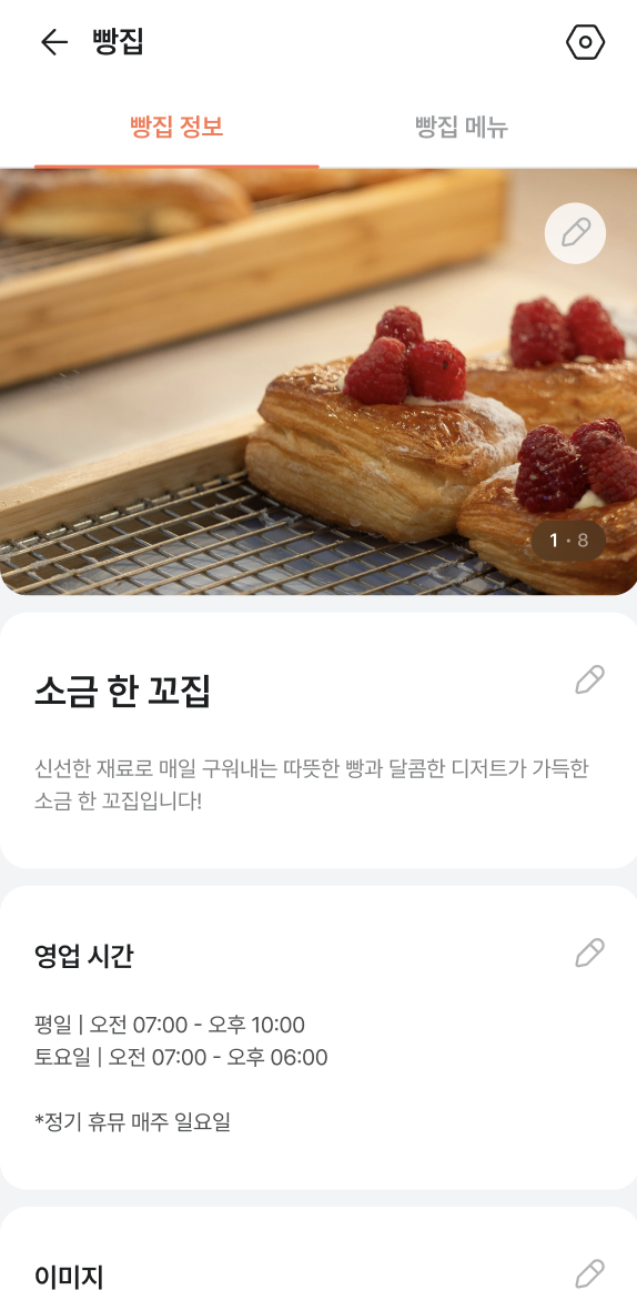 | λΉ΅μ§ μμΈ μ 보 νμΈ - μ£Όμ, μ΄μ μκ°, λ©λ΄, μμ½ κ°λ₯ μκ° λ± νμΈ κ°λ₯ | λΉ΅μ§ μ΄μμν κ΄λ¦¬ - λ§€μ₯ μ΄μ μκ° λ° μμ½ κ°λ₯ μκ° μ€μ - λ©λ΄ μ¨κΉ μ²λ¦¬(νλ§€ μ€μ§/μ€λΉ μ€ λ©λ΄) - μ¬κ³ μλ λ³κ²½ - μ μ ν λΉ΅μ΄ λμμ λ μ¦κ²¨μ°ΎκΈ° κ³ κ°μκ² μλ¦Ό μ μ‘ κ°λ₯ |