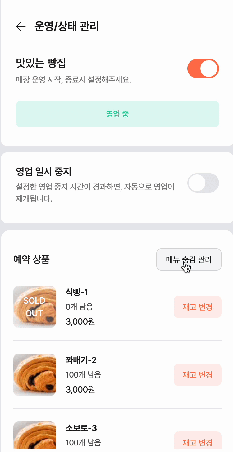 - νλ§€ μ€μ§νκ±°λ μ€λΉ μ€μΈ λ©λ΄λ μ¨κΉ μ²λ¦¬νμ¬ κ³ κ° νλ©΄μμ 보μ΄μ§ μκ² ν μ μμ΄μ.